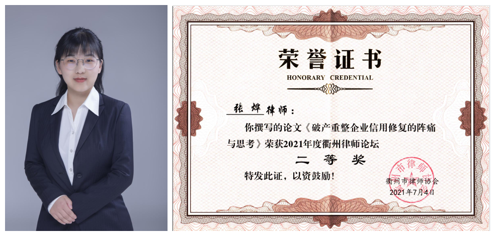 在刚刚落下帷幕的2021年度衢州律师论坛论文评比中,青风所共有13篇论文参赛,5篇论文获奖。其中,张烨律师撰写的《破产重整企业信用修复的阵痛与思考》一文获得二等奖,其余四篇获得优秀奖。青风所获“优秀组织奖”。